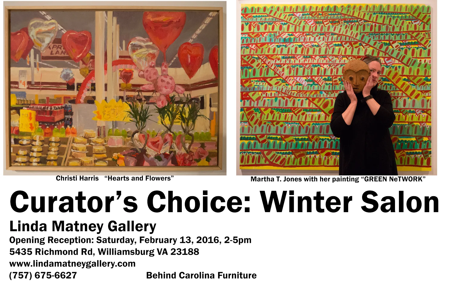 Opening Reception for the Curator's Choice:Winter Salon Exhibit. Enjoy refreshments and meet artist Martha T. Jones. See works by 32 artists in the main gallery.