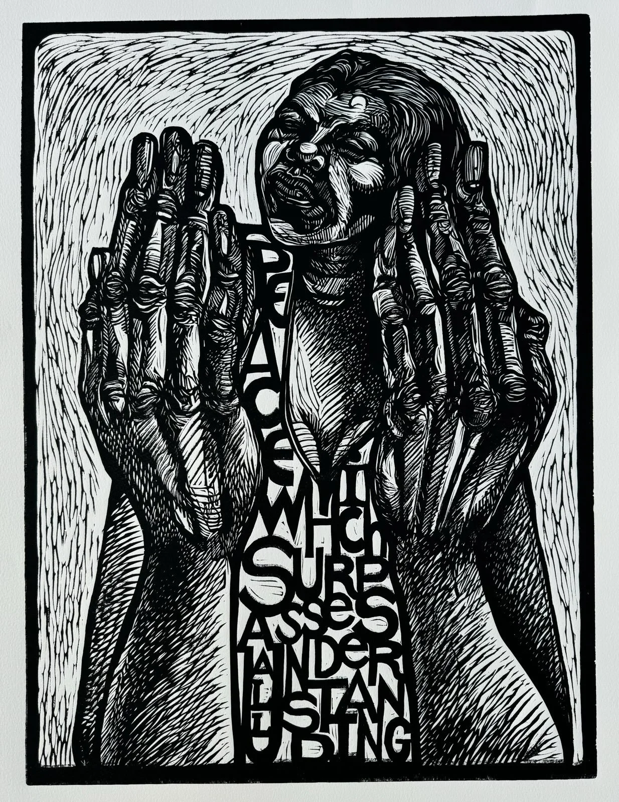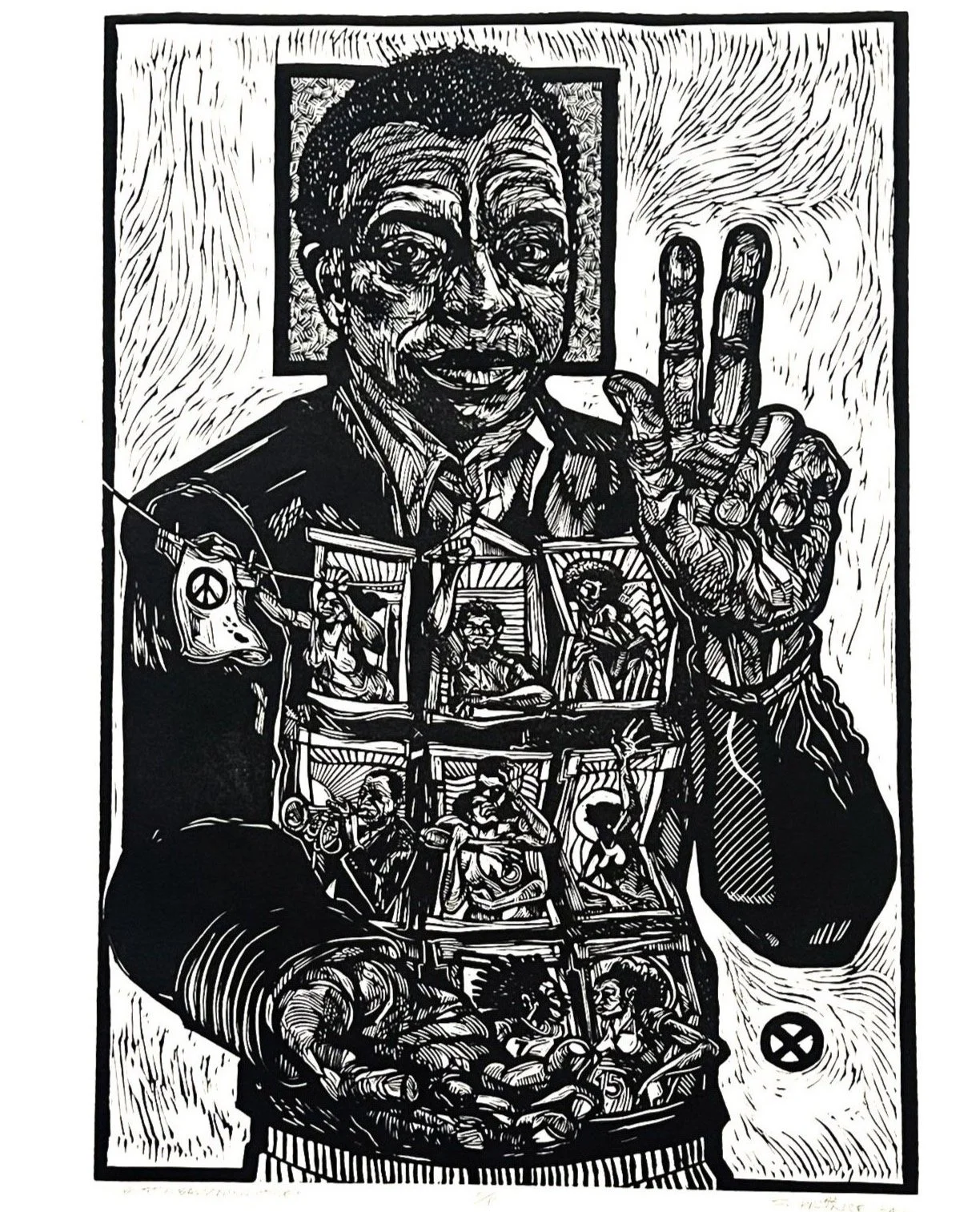 Umoja: Baldwin, Linoleum Cut, 6” x 9”, 2024 (detail) Umoja means unity. This image is a study for the larger work I created titled Ubuntu: Baldwin’s House celebrating the 100th anniversary of the famed author, philosopher, humanitarian, James Baldwin. The houses, buildings, and church structures synergistically morph into Baldwin’s body expressing his heart and oneness with the community. His craft was in service to the people and generations. PURCHASE THIS PRINT