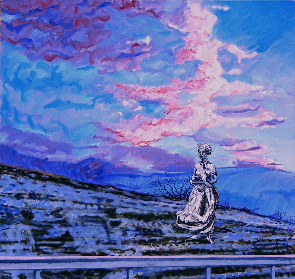 Betty Sweat by 340 depicts an African American laborer documented by Strother on the Virginia waterfront in the 1850's. Highway 340 passes through an area once sustained on the back of slavery and the enslaved came from our nations ports. Some escaped along the underground railroad. I leave it up to the viewer the reason in which a woman like Betty Sweat is standing along this highway.