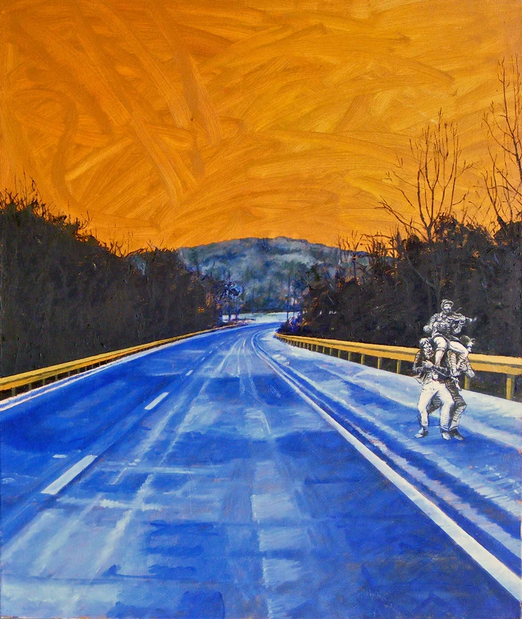 The highway images in the gallery are from a series that was exhibited at the Museum of the Shenandoah Valley through January 2014 called “These Two Highways." The paintings making up this series are meditations on highway 70 and 340, specifically the section of these two highways running west from Baltimore, through West Virginia, into northwest Virginia. The paintings feature personal interpretations I have made of the landscape based on traveling along these highways, juxtaposed with reinterpretations of figure drawings by 19th century Harper's illustrator, writer, and journalist, David Hunter Strother, better known by his pen name Porte Crayon. Extracted out of their original and sometimes problematic contexts more than 150 years later, many of the figures represented in these works are within an hour's drive of where they were originally drawn. The monochromatic nature of the figures in the paintings was a push against traditionally unifying the 19th century figures with the 21st century landscape. I wanted the figures to feel cutout of another world. This was inspired by the jarring juxtapositions taking place in my mind’s eye, and I wanted the work to reflect that through the lack of color. You call them ghostly and I am not opposed to that description, as there is tremendous amount of tumult in the history of the landscape I depict in this series. These are the kind of scenes I have imagined commuting on these highways over the years.