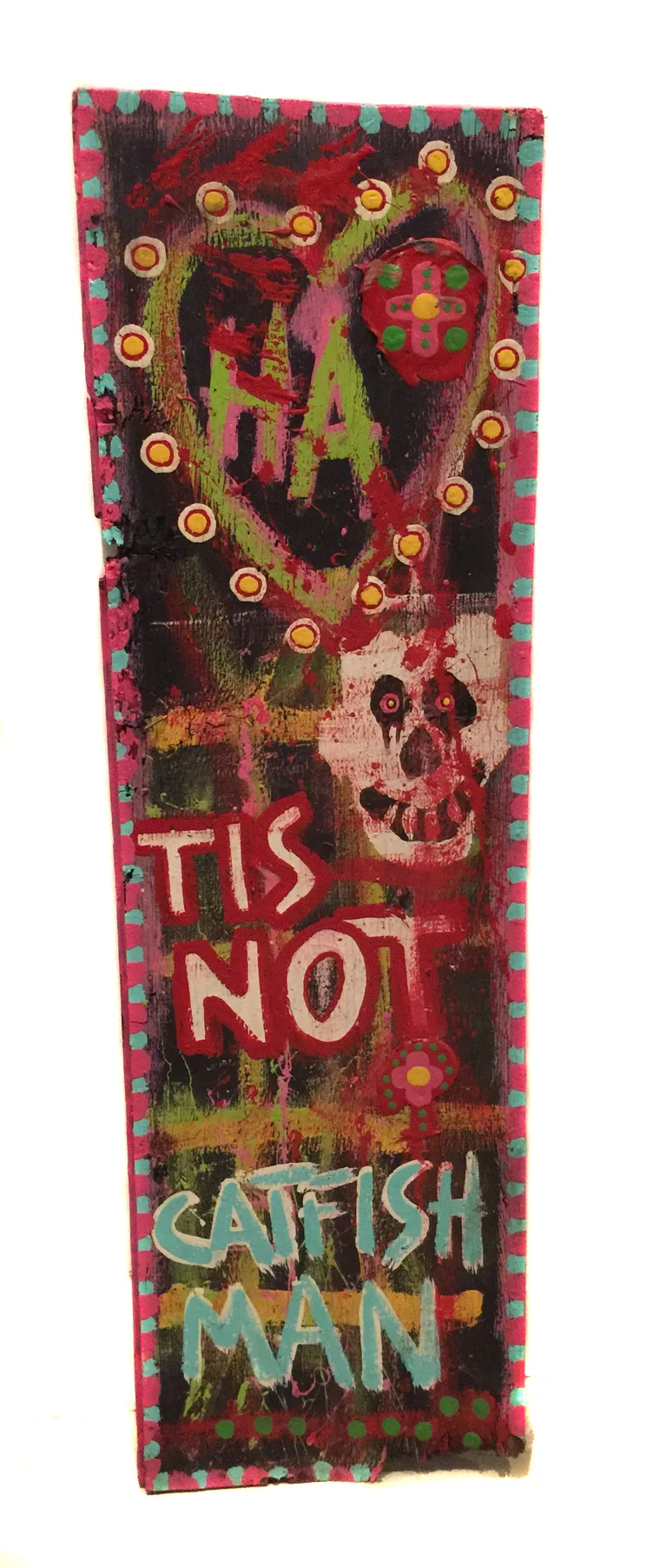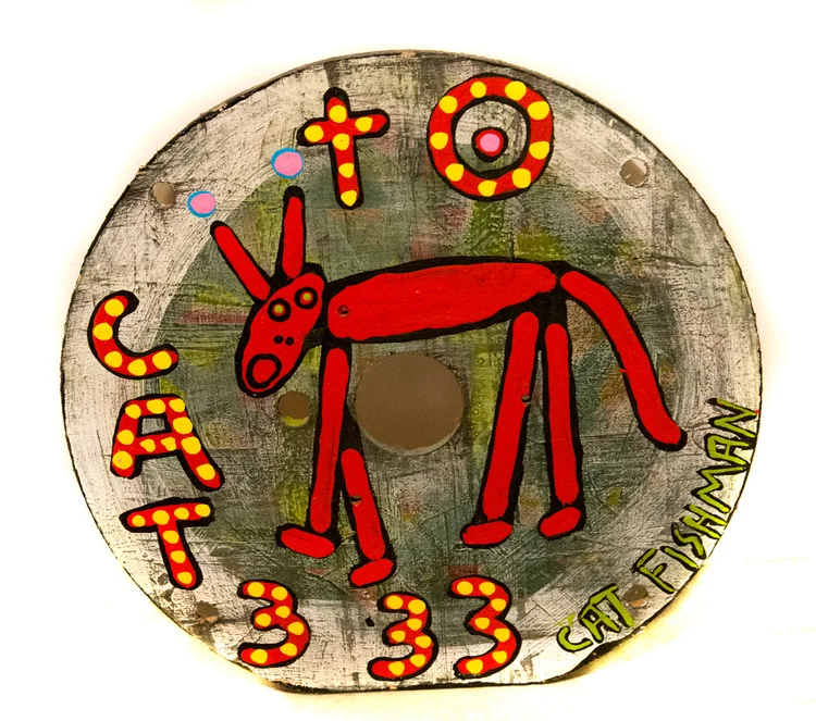 I thought what the hell is this, and I piled up some wood as a sort of sculptural thing and was basically showing publicly that I am an artist now. And I looked at and looked at it over several days, none of the pieces were signed. I began painting outside and signing them Catfish Man. It was part of the work of art really. It seemed to suite it, it was just so crude and so rough, you know, almost like something you would find in a ditch. Literally, in fact I did find a lot of the things I painted on in ditches or along the river bank. It then turned out that there were a number of people in the region that were looking for primitive, folk, and outsider artists and one of these collectors expressed interest in me and I began selling work. I began trying to develop my style from within. I knew that there was the outsider and folk thing happening and I was told that that was what I was doing, so I decided to explore that element in my work. Anyway for about five years I just relentlessly painted, painted, painted and randomly tried to find what I called my “ultimate style.” I really just wanted to be able to be a master of the use of paint. I taught myself how to not mix the colors while they are still wet to not make mud, Keep the colors pure, you know all of these basic things. On the one side there was the skill of using the paint, but during the process of creating about 1,500 to 2,000 pieces I discovered this thing that might be described as the “trance state,” when you are in somewhat of a trance when creating. Rather than trying to make something you just begin moving your arm around with the paint brush. Of course you are conscious of it to some extent, but you try release yourself to the trance as much as possible. So I discovered that fairly early on and I also discovered what paint and color would do but still in a primitive manner. For example, I noticed that if you use red and green certain things happened. I discovered several techniques that I would use to give the paintings vibrancy. I knew that was power or a type of power, energetic power, emitting from the board. So I was trying to combine subconscious images and allow them to emerge through putting the color down with these few basics that I had learned along with other elements to give the piece motion. On those earlier pieces I defined them near the end. They would take form and I would outline them with black. These things anybody would stumble across if they took enough time, but I took it very seriously and tried to remember it all. So yeah, that would pretty much be that.