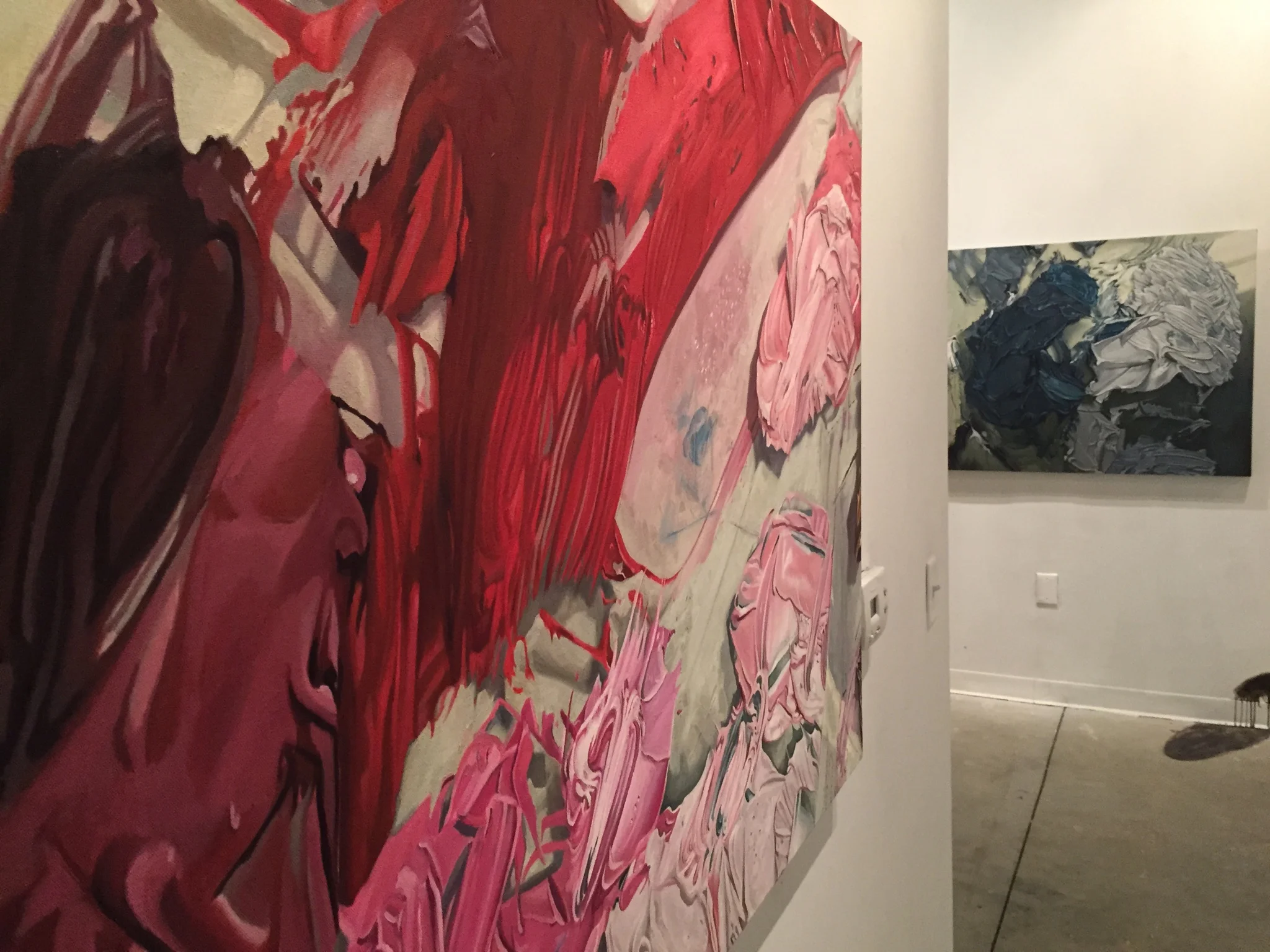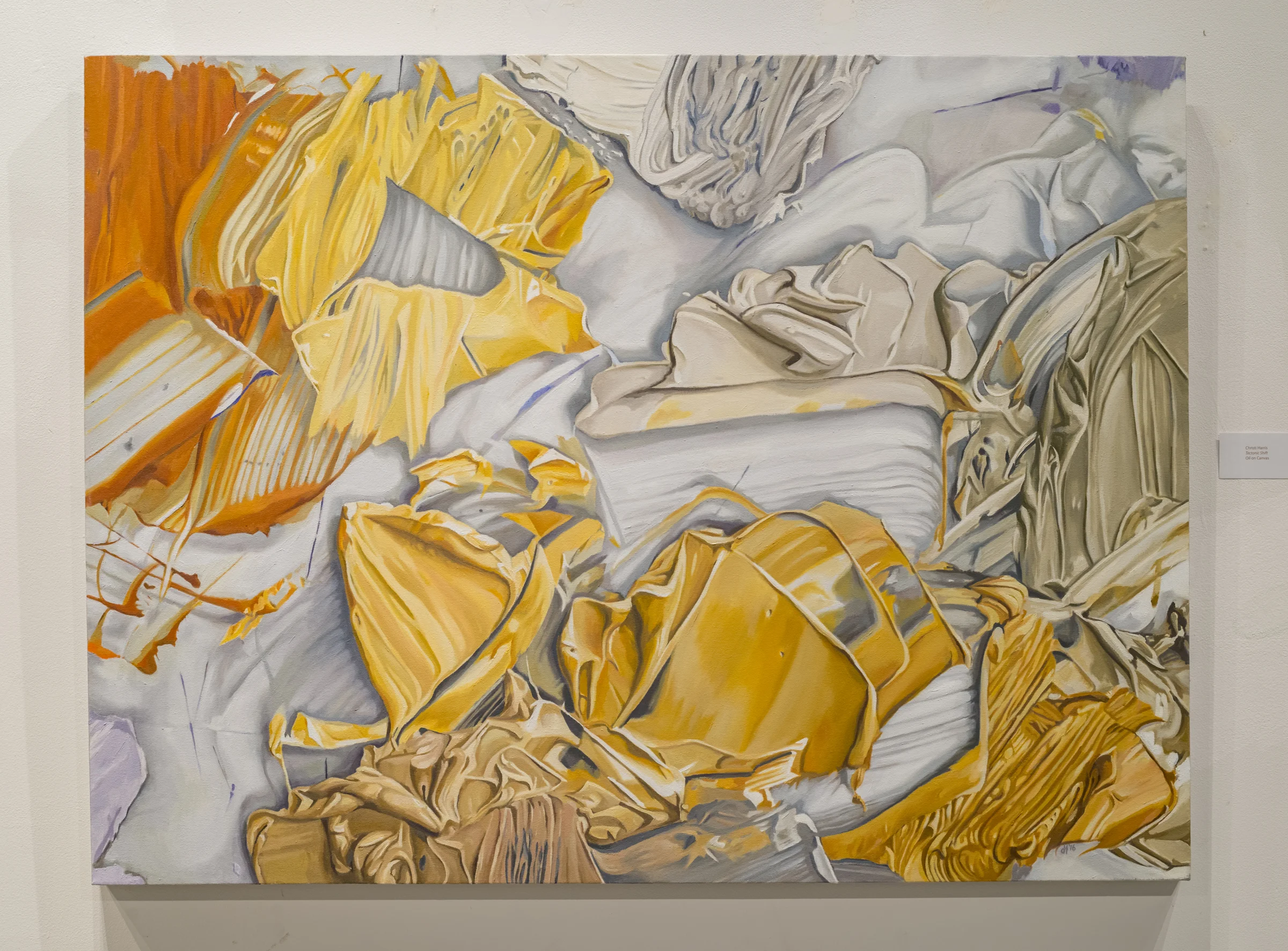 Christi Harris has large scale paintings reproducing the gestural, glossy brush strokes seen in a painter’s palette. Her paintings offer an almost trompe l’oeil effect, so that the paint itself appears tactile to the touch. The palette of the painter that she simulates is itself a place of process, a location of the mixing of pigments where the painter dabs and stretches the medium in the practice of completing a painting. The palette itself is also a thing of beauty, as Harris demonstrates.