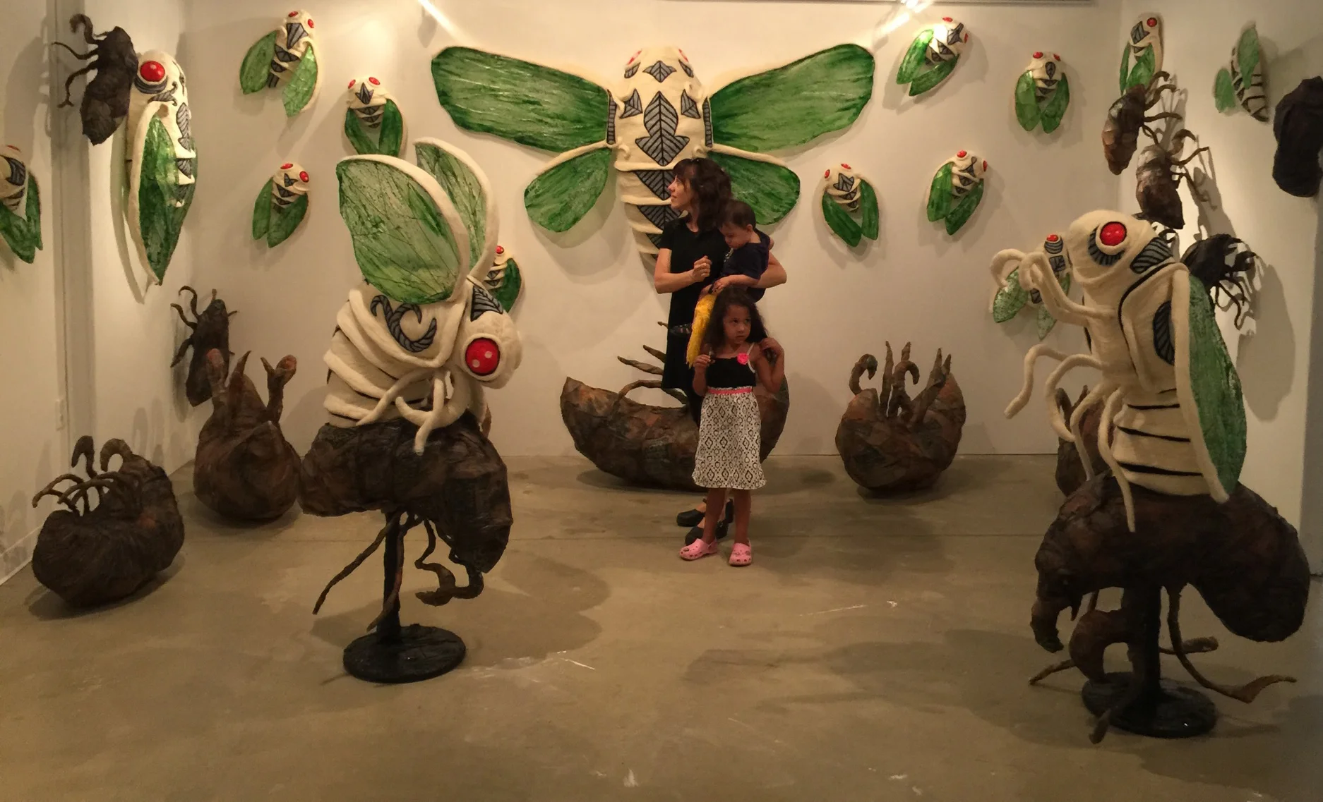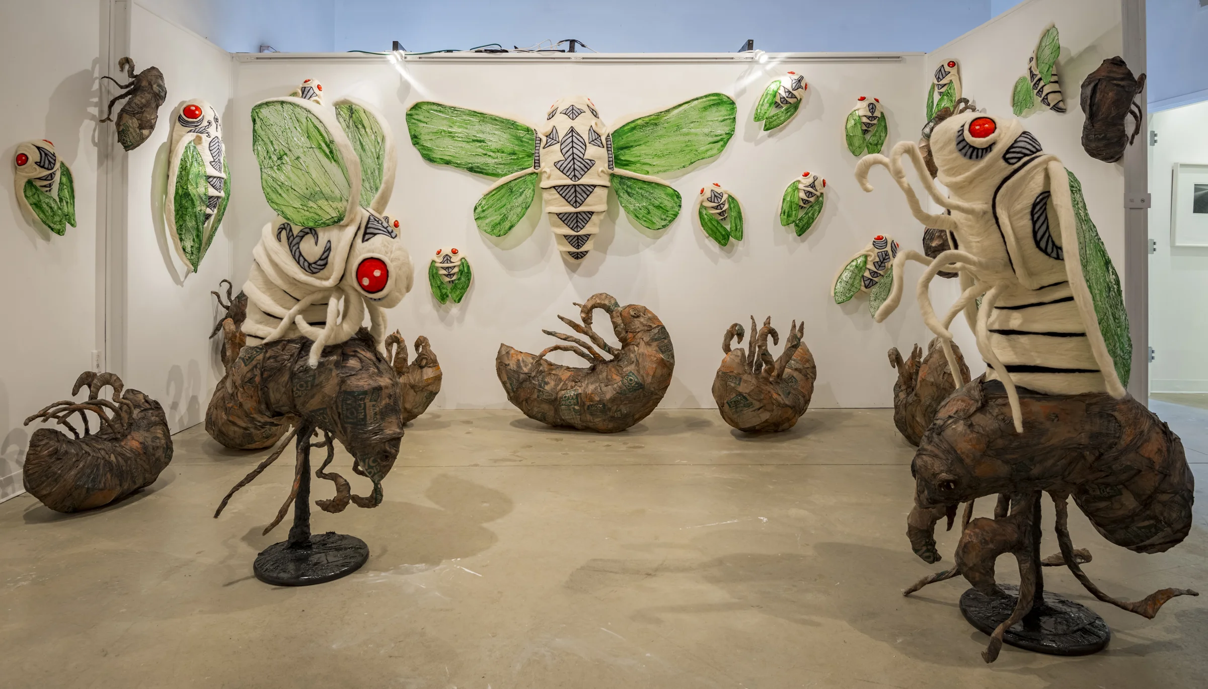 The exhibition displays an installation of colorful, animated cicadas in Ryan Lytle’s “Emergence.” With their bright red eyes, large green wings, and soft white bodies made of dense fabric, the cicadas arise from the dead shells of their former selves shaped with Home Depot plastic bags, further demonstrating the connection between construction and deconstruction of material as change occurs. Lytle explains that cicadas symbolize “transformation, rebirth, and immortality.” With some cicadas having a wingspan of six feet wide, the installation is a vibrant imaginative space for viewers to explore.