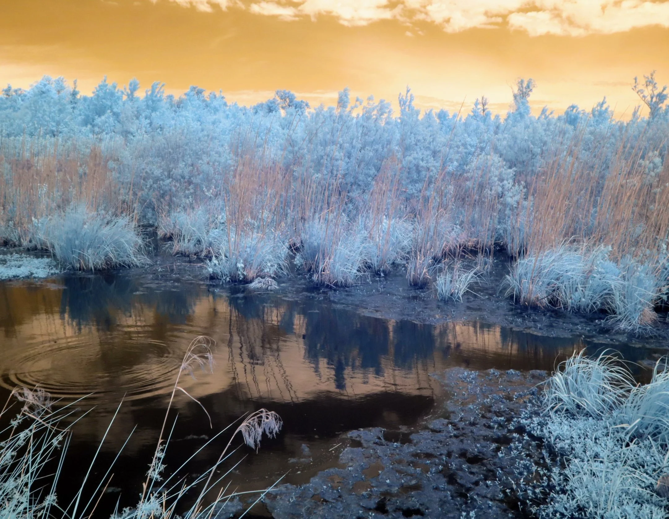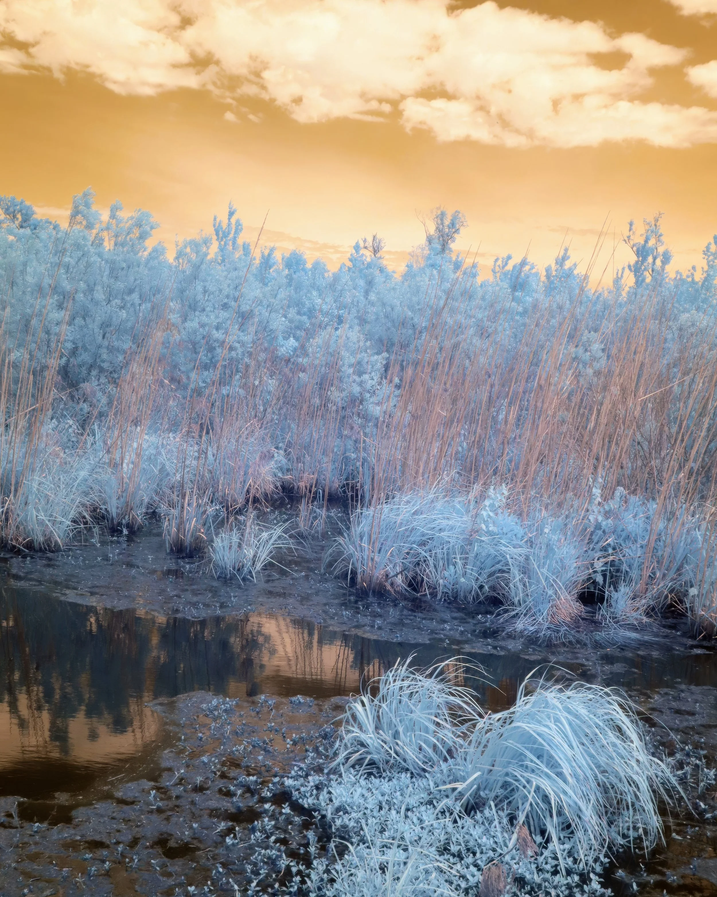 I have photographed the Swamp in every season of the year with color infrared, to understand how the tones, landscape, and conditions change. Spring and autumn offer the best landscapes for capturing lush foliage that reflects the heat of the sun. In winter, photographs have an icy look, where the infrared detects frozen chlorophyll and reacts to it without the reflection of heat.
