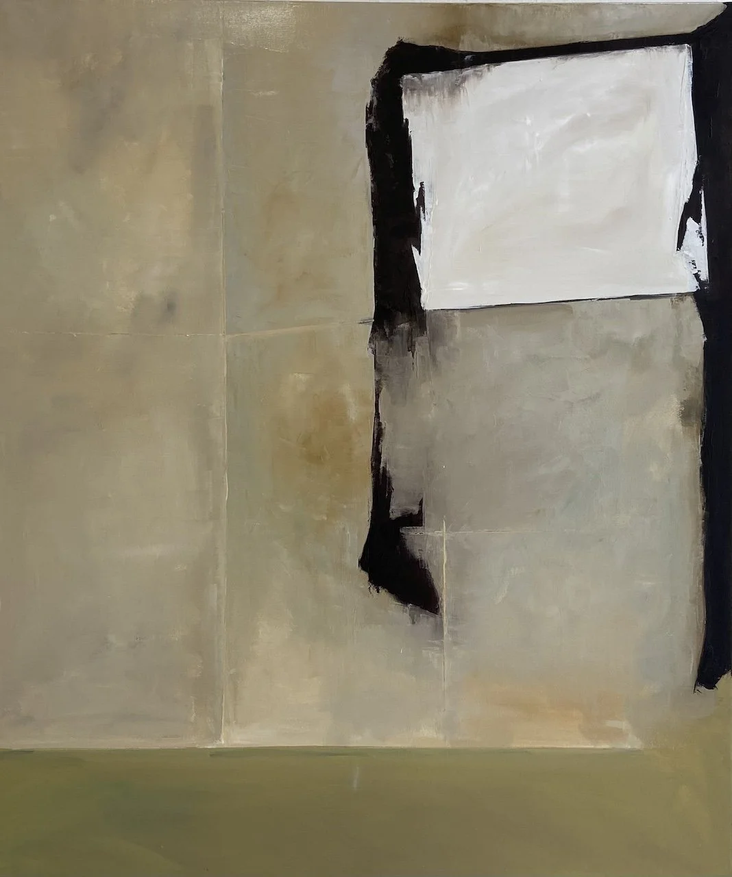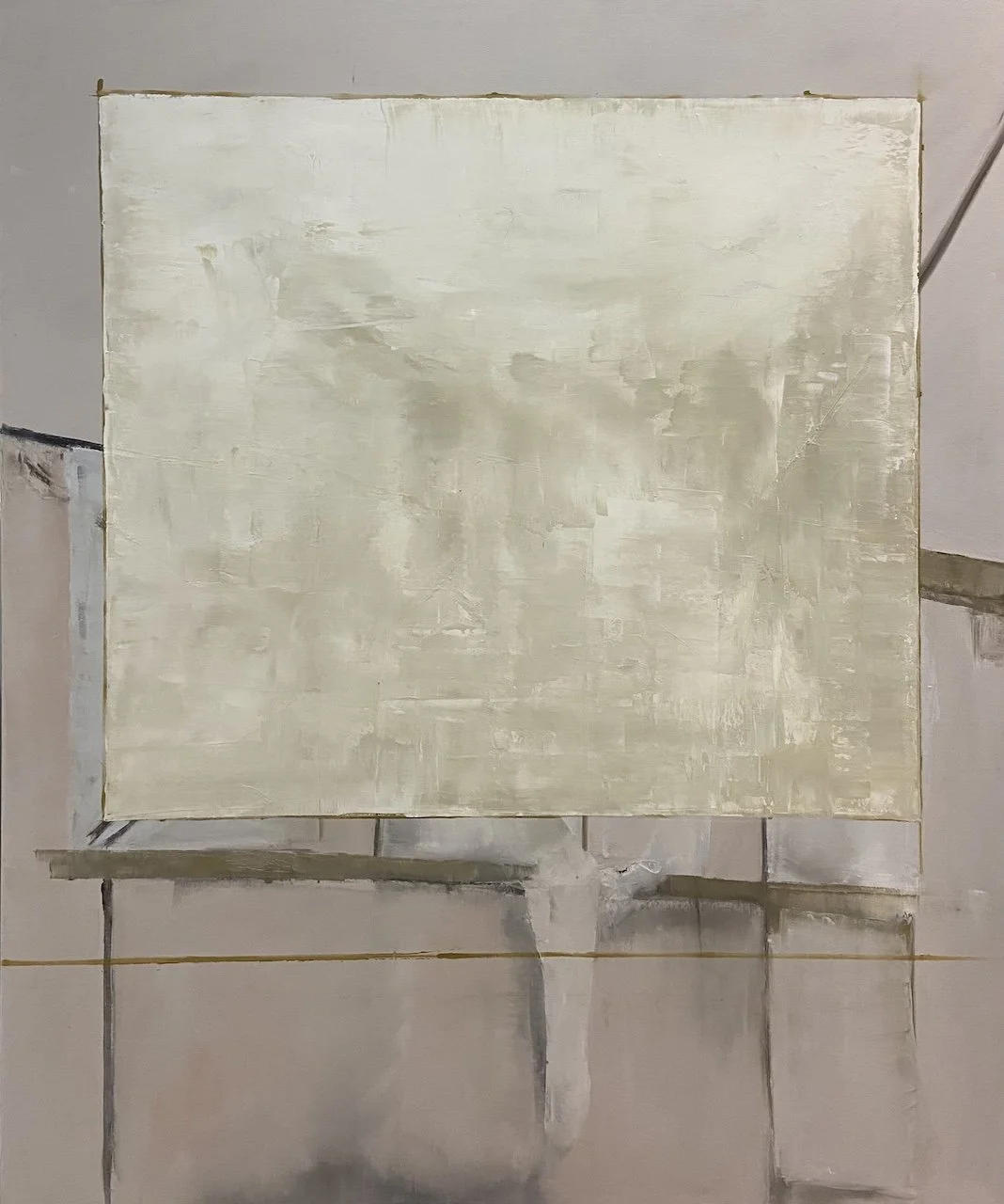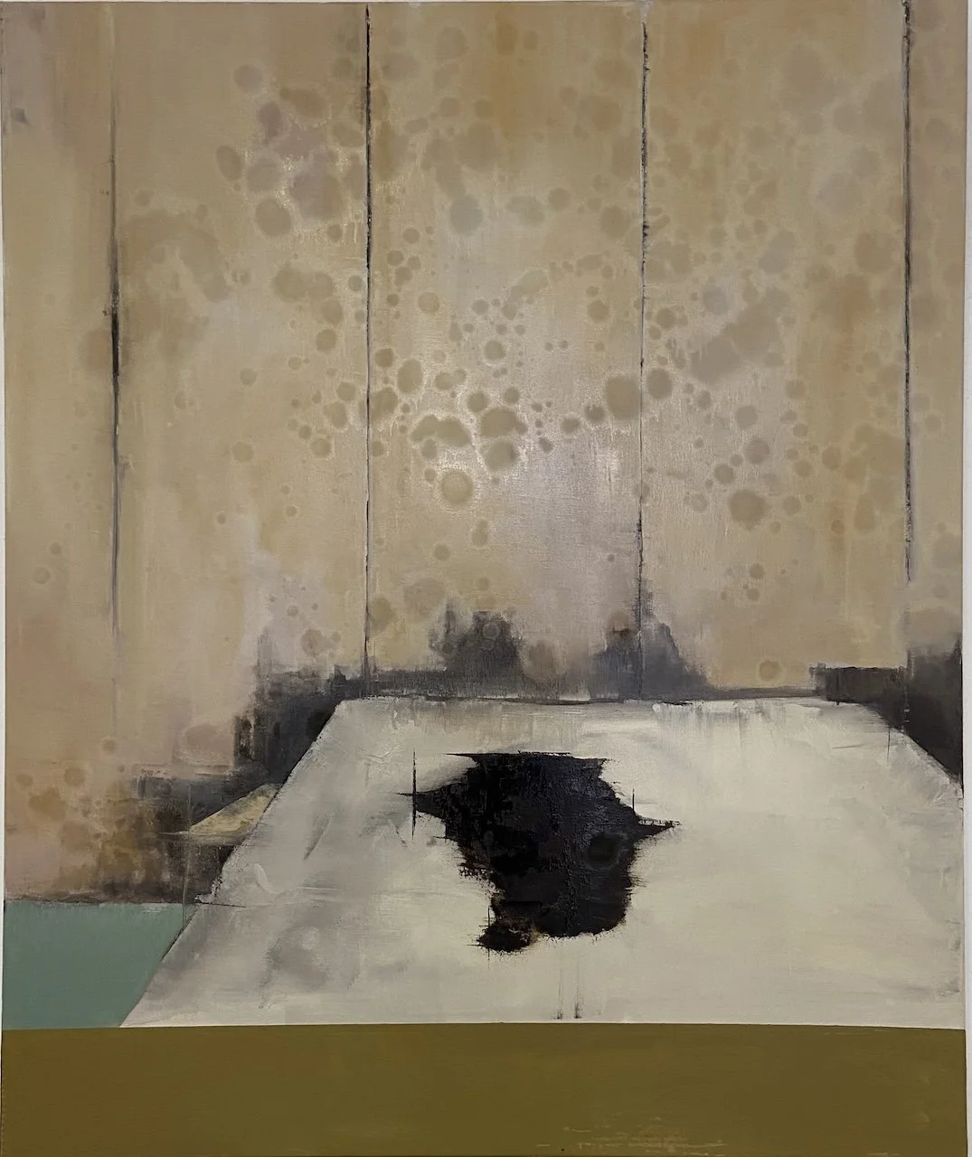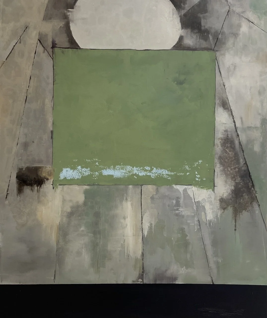 Ruller speaks of process in terms many painters will recognize: mapping, destroying, rebuilding. Works may begin as legible landscapes before being dismantled and remade—scraped, muddied, layered—until representation loosens and another structure asserts itself. The lineage to Richard Diebenkorn runs through this cycle of building and undoing, a learned willingness to sacrifice the “finished” for the work that might exist on the other side of risk.