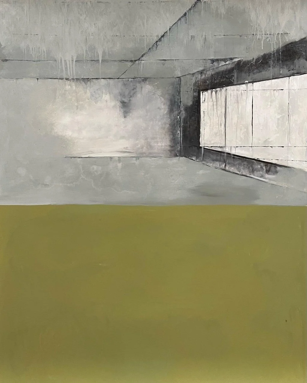 For Ruller, these are not journalistic subjects so much as embedded memories. He recalls swimming as a child in a stream that ran near a mill, then photographing those condemned interiors as an adult—acidic puddles, collapsing passageways—so the “feel” of those spaces could be worked back into his surfaces. The paintings don’t illustrate a site; they carry forward its atmosphere: the smell of clay and rust, the sensation that the ground itself is unstable, the sense that time is peeling everything away.